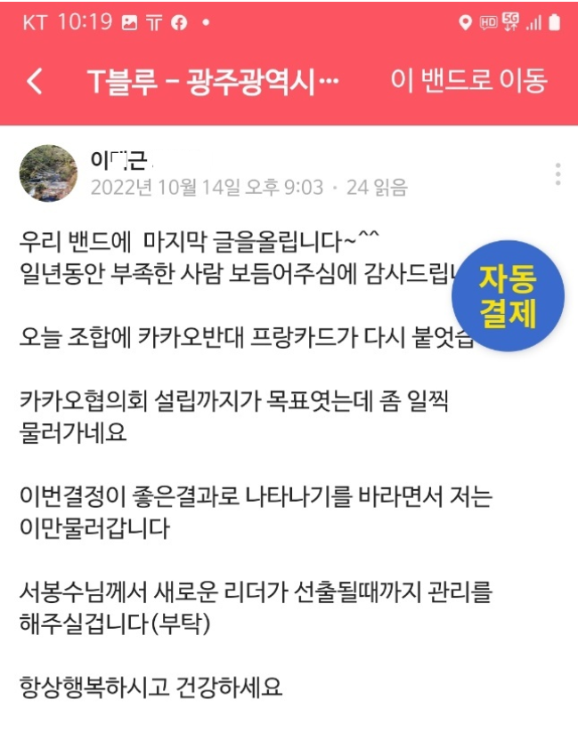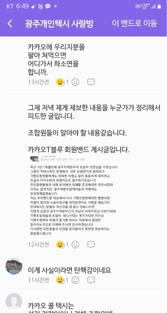 ▶ 아래는 이땡근 대장님이 2022년 10월 12일 오후 7:43에 카카오T블루 밴드에 올린 글이다.