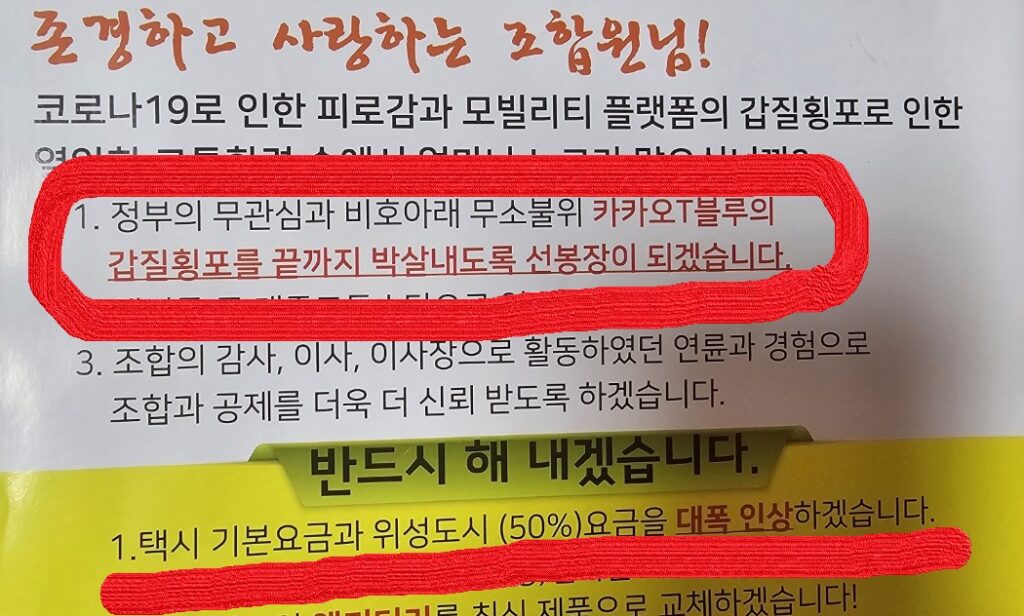 ② 이 상생 협약에 대해 모욕감을 느낀 ‘카카오T블루’에 가입한 조합원들이 반발하자