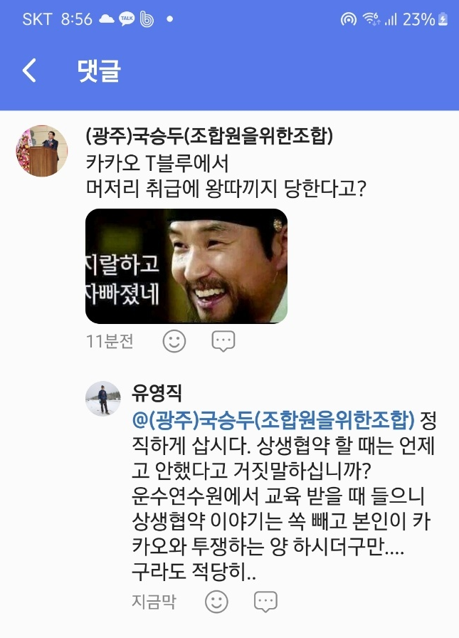 이때 이땡근 대장님과 측근 서땡수는 ‘카카오T블루’ 밴드에서 껄끄러운 조합원들을 모두 강제 탈퇴시켰다.