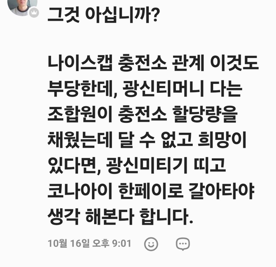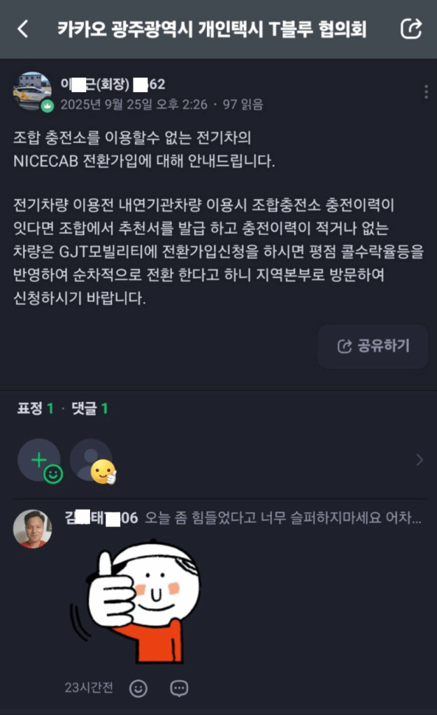 GJT의 이익을 대변하는 이땡근 대장님은 조합의 충전 요건에서 차별 받는 전기차 택시도 평점 등을 반영하여 나이스캡으로 전환해준다고 공지했다.
