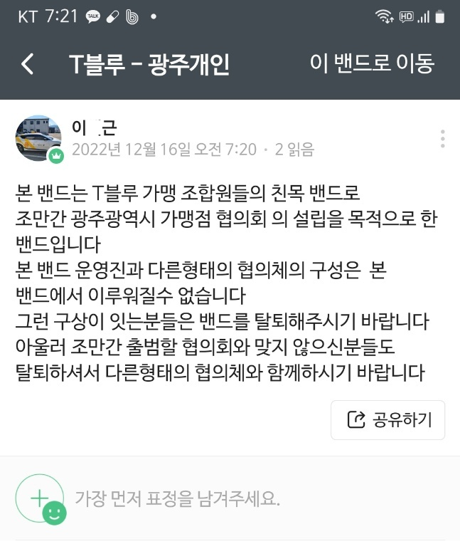 본 밴드는 T블로 가맹 조합원들의 친목 밴드로