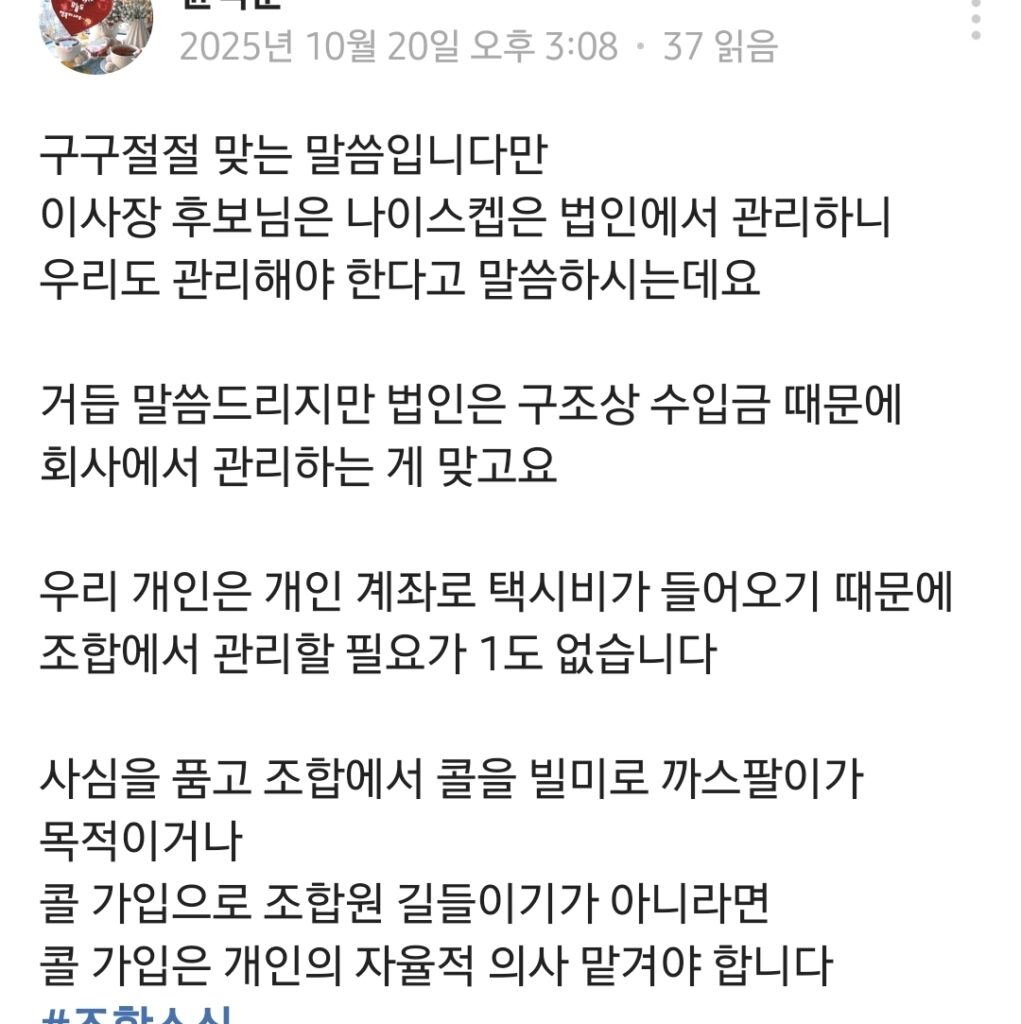 모 조합원은 나이스캡 가입은 개인의 자율적 의사에 맡겨야 한다고 정답을 제시했다.