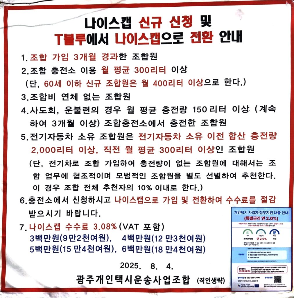 광주개인택시조합의 조합원은 시중가보다 비싼 충전소를 이용하고, 앱미터기를 교체하며, 신협 조합원으로 가족을 가입시켜야 나이스캡에 가입할 수 있다.